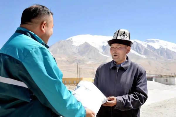 投递员阿克阿不都赛米·赛买提(左)把包裹送到新疆克孜勒苏柯尔克孜自治州阿克陶县布伦口乡布伦口村夏迪别克·排尔慢手中。邮路延伸到雪山脚下,让生活在边疆的各族民众也能享受到和城市居民一样快捷方便的邮政服务(9月9日摄)。新华社发